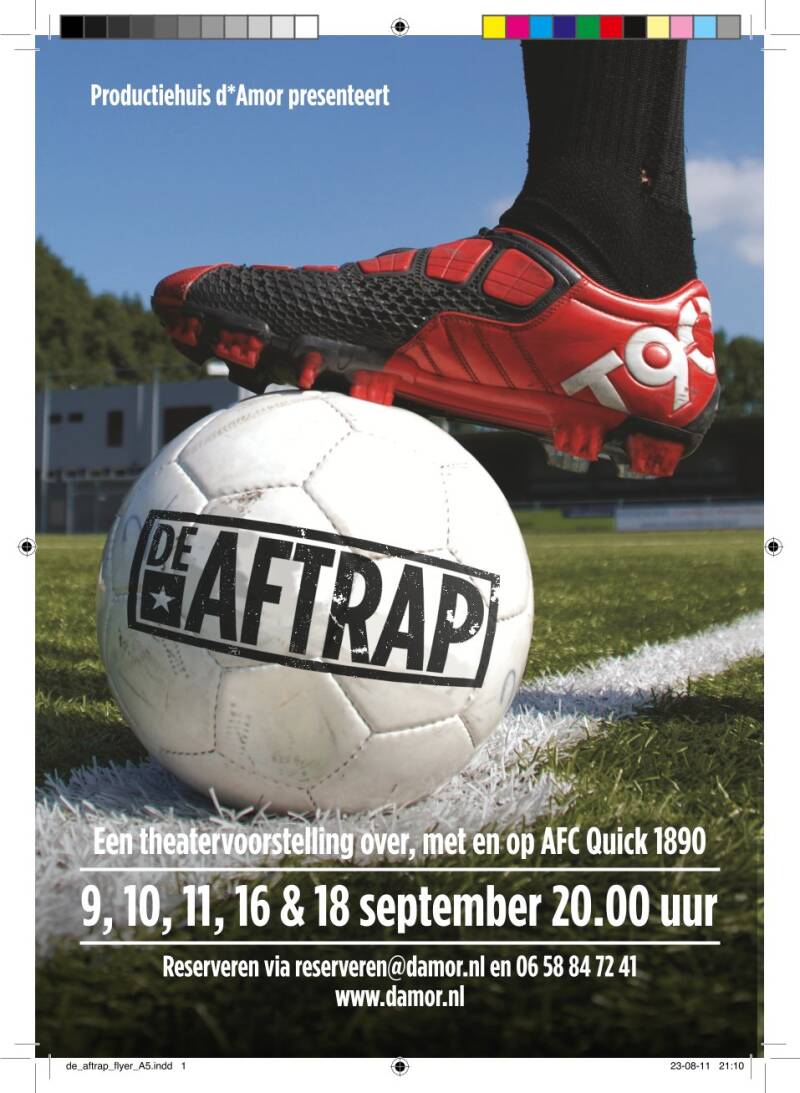 Locatievoorstelling De Aftrap regisseerde ik in in 2010, 2011 & 2012 over met en op 7 amateur voetbalverenigingen door het land. Met voorstellingen bij: v.v. Hoogland, AFC Quick 1890 Amersfoort, SV de Meern Utrecht, de Knickerbockers Groningen, vv OSC Nijmegen, WV-HEDW Amsterdam & SWIFT Amsterdam. Zie onder wat beelden gefilmd door de NOS. Ook onder ander beeldmateriaal en een samenvattend filmpje van mijn eerste voorstelling bij mijn toenmalige vereniging v.v. Hoogland. Daaronder recent opgedoken beelden van AFC Quick. Ook beelden van de kleine voetbalvoorstelling SCOREN die ik als onderzoek maakte en speelde voor Gluren bij de Buren.