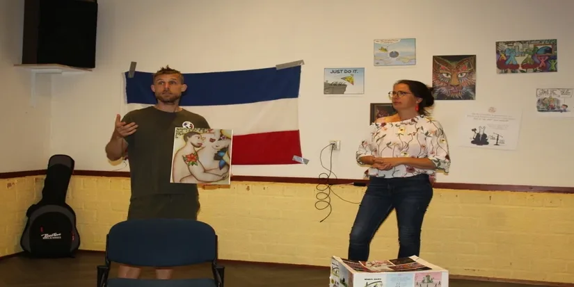 Daan leidde vrouwen van de Taalschool Danner en Danner rond bij Expositie Rebelution. Dat leverde mooie gesprekken op met veel herkenning, een leuke uitwisseling! "We hebben een super interessante ochtend gehad" schreef de docente. Het was fijn om alle werken rond te gaan en de reacties van ieder te zien voelen en horen.