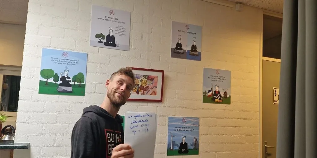 Elke week staat op de achterpagina van De Andere Krant een meme van The Daily Lama. Deze spotprent – een knipoog naar de steeds onheilspellendere situatie in de wereld – komt van designer, boeddhist, dwarsligger en vragensteller Jesse Braun (54). Hij aanschouwt het “clowneske wereldtoneel” vanuit zijn woonplaats Kyoto in Japan. Zijn missie: aantonen in welke “nonZens” we leven en “zonder halfzacht gedoe” zijn lessen over taoïsme en zen boeddhisme delen. Danielle interviewde Jesse Braun voor De Andere Krant: bit.ly/lamadak. "Ik zie Nederland als een openluchtgevangenis, mensen zitten vast in het slaaf-denken, lopen voorop met deugen en reageren constant op termen van de roverheid en EU, in plaats van zelf de aanval in te gaan en de regels bepalen." Bij Expositie Rebelution zijn 29 tekeningen van The Daily Lama te zien die hij digitaal gemaakt heeft.