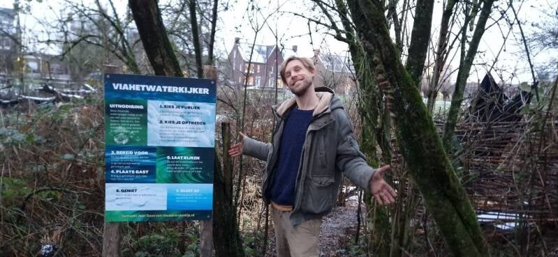 De ViaHetWaterKijker is een theatrale waterspiegel op het landgoed van Metaal Kathedraal, die je uitnodigt om iets voor iemand te maken, hier en nu. Een gedicht, lied of gedanst beeld dat jij voor iemand in het bijzonder speelt. Ik leerde allerlei moois tijdens het waterthema zoals dat we water met onze gedachten, woorden en daden kunnen versterken in hun lading waardoor het levendiger en gezonder wordt.